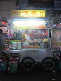 Nous arrivons à destination, devant le regard amusé des vendeurs ambulants. Nous nous réfugions sous un parasol et trouvons une table pour manger. Nous commandons de la nourriture dans trois stands différents: curry mee (soupe de nouilles au curry), laksa malais (nouilles au poisson) et riz sauté aux crevettes!